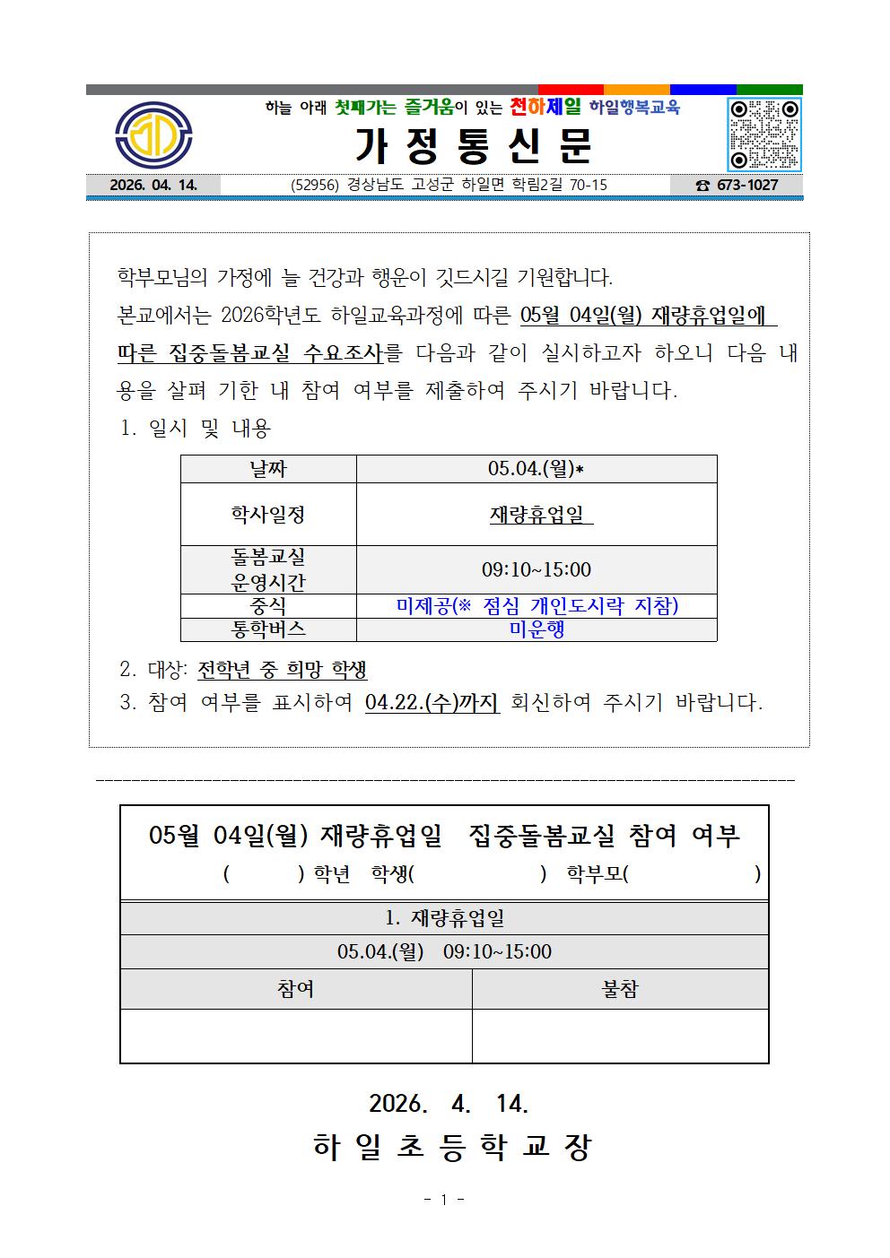 2026. 초등집중돌봄교실 가정통신문 (수요조사 5월 4일재량휴업일).hwp
