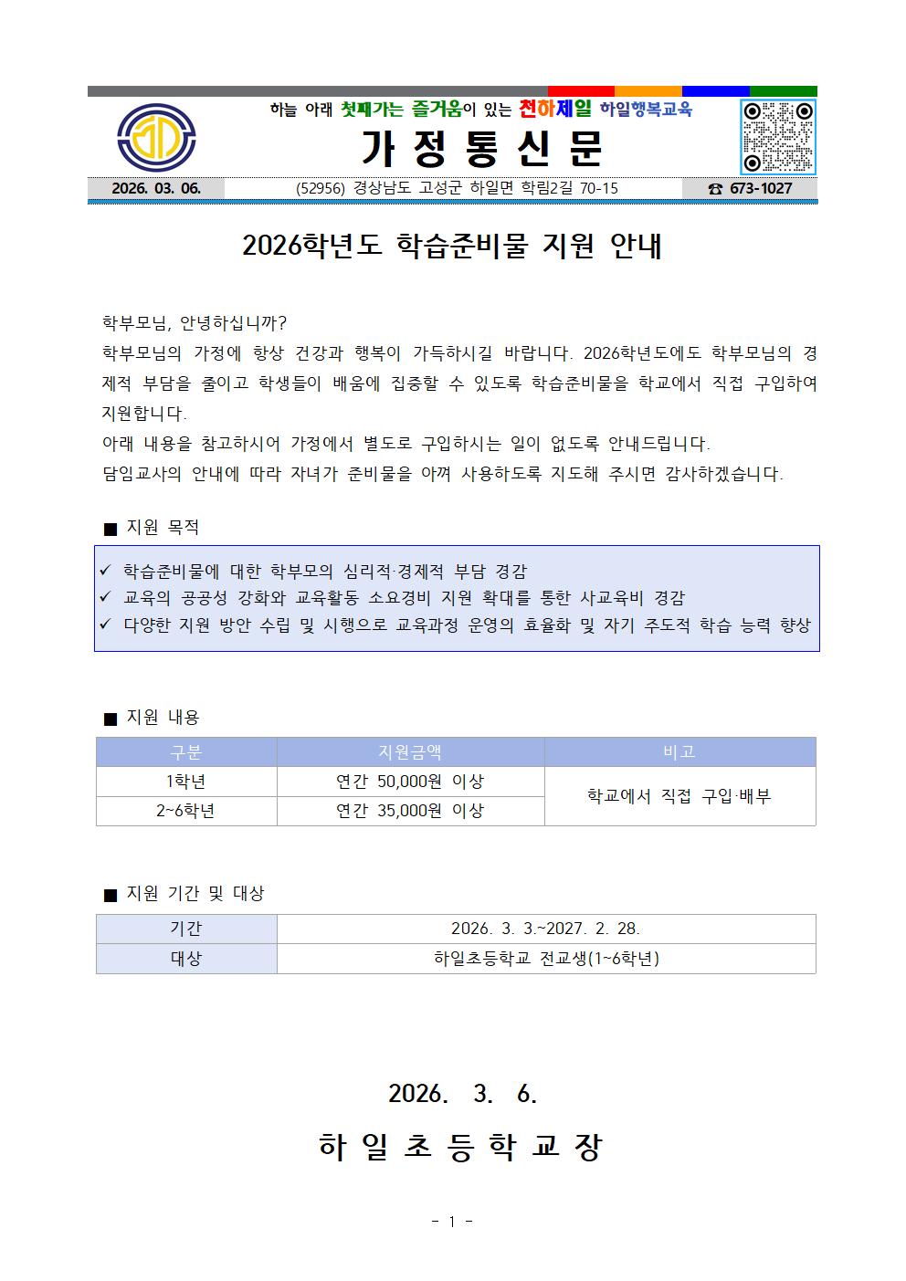 2026학년도 학습준비물 지원 안내장