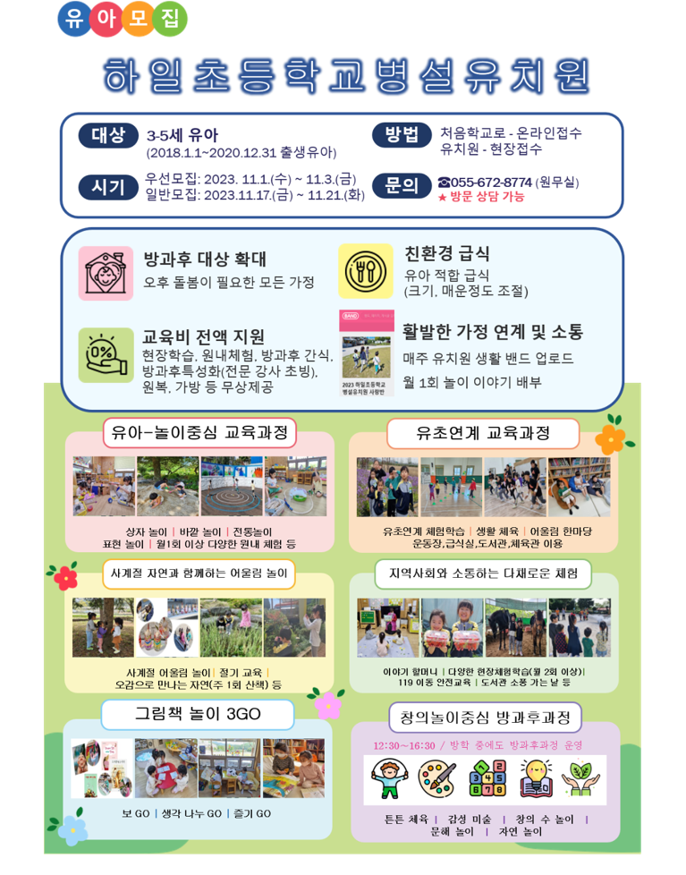 2024학년도 하일초등학교병설유치원 유아모집을 실시 합니다.